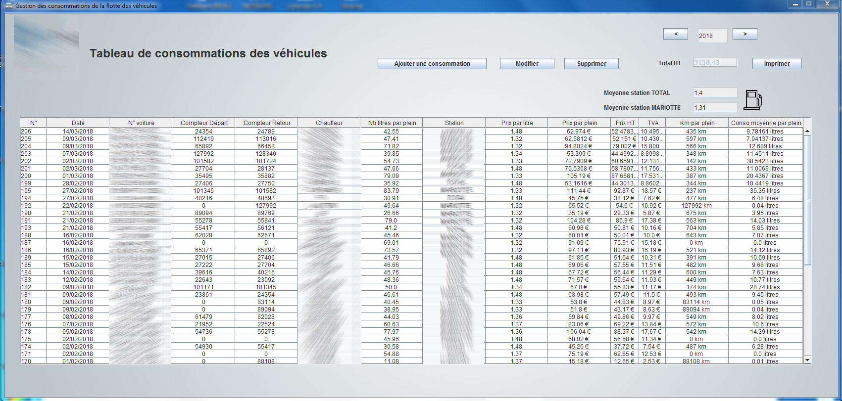 Un tableau est dès lors accessible et imprimable. Celui-ci contient toutes les entrées ajoutées par les différents employés. De plus, des informations intéressantes sont affichées, comme le prix moyen de chaque station d'essence, calculé en fonction des résultats inscrits par les employés.